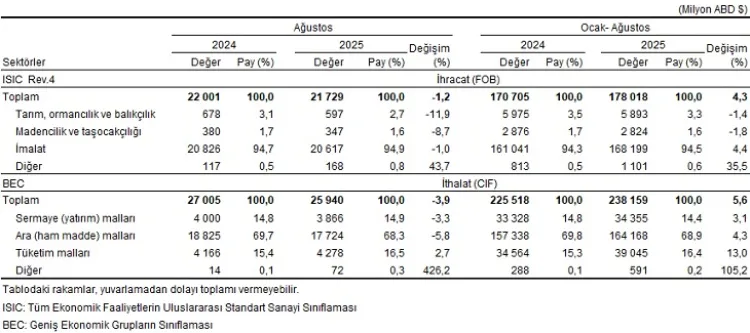 Ağustos’ta imalat sanayi ihracatı yüzde 94,9 pay aldı; tarım yüzde 2,7, madencilik yüzde 1,6. Yüksek teknolojili ürünler imalat ihracatının yüzde 4,2’sini oluşturdu. İthalatta imalat yüzde 82,3, yüksek teknolojili ürünler yüzde 11,4 pay aldı. Ocak-Ağustos’ta imalat ihracatı yüzde 94,5, yüksek teknolojili ürünler yüzde 3,7; ithalatta imalat yüzde 81,0, yüksek teknolojili ürünler yüzde 11,2.