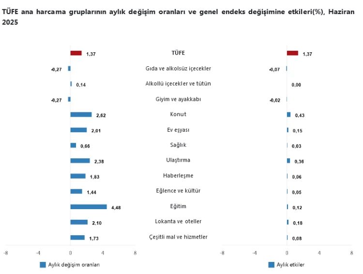 TÜİK verilerine göre, Haziran 2025’te TÜFE yıllık yüzde 35,05, aylık yüzde 1,37 artarken, gıda ve alkolsüz içeceklerde yıllık yüzde 30,20 artış, aylık yüzde 0,27 azalış kaydedildi.