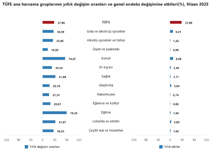 Nisan 2025’te TÜFE yıllık yüzde 37,86, aylık yüzde 3,00 arttı. En yüksek yükseliş yüzde 74,07 ile konutta yaşandı.
