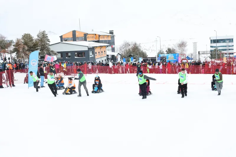 Erciyes Tekir Kapı bölgesinde yapılan yarışmaya farklı şehirlerden 10 çift katıldı. Yarışmada çiftler önce kızakla birbirlerini çekti, ardından hiç ara vermeden birlikte kızakla kayarak bitiş noktasına ulaşmak için mücadele etti.