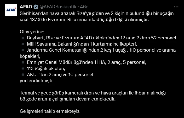 AFAD, Sivrihisar’dan Rize’ye giden ve Erzurum-Rize arasında düşen küçük uçakta bulunan 2 kişi için geniş çaplı arama kurtarma operasyonu başlattı.