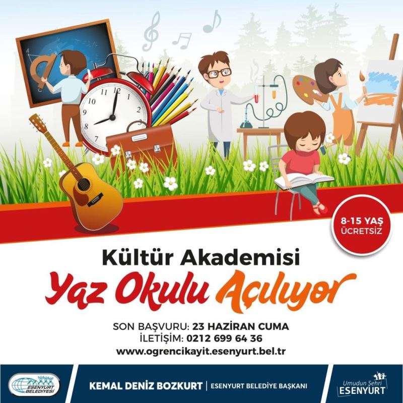 Esenyurt Belediyesi, 8-15 yaş arasındaki Esenyurtlu çocuklar için dolu dolu bir yaz okulu programı hazırladı. Kültür merkezleri, bilgi ve etüt evleri ile gençlik merkezlerinde gerçekleşecek olan Yaz Okulları’nda, matematik atölyesi, gitar ve bağlama kursu gibi 22 farklı branşta atölye ve kurs düzenlenecek.