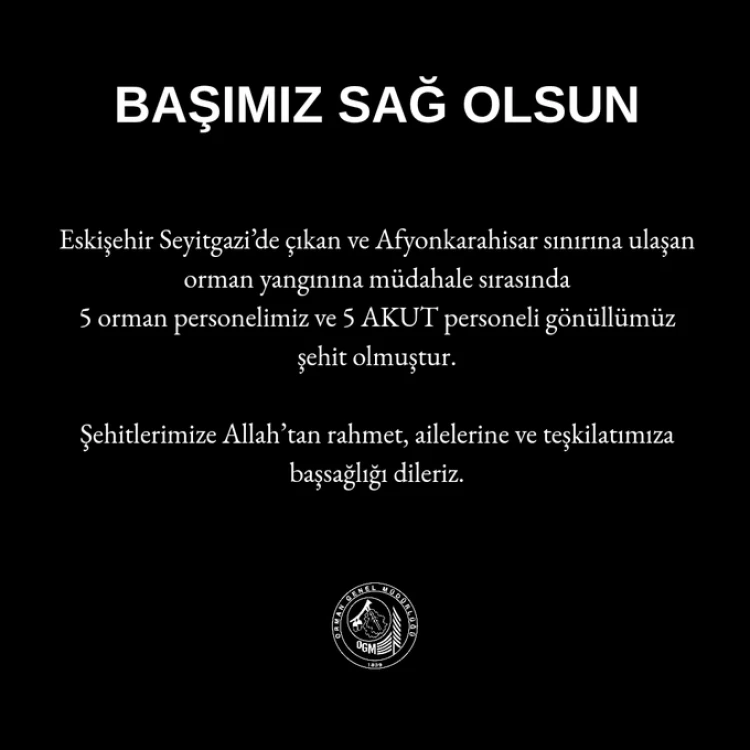Ayrıca Orman Genel Müdürlüğü de "Başımız sağ olsun" diyerek yayımladığı başsağlığı mesajında, "Eskişehir Seyitgazi'de çıkan ve Afyonkarahisar sınırına ulaşan orman yangınına müdahale sırasında 5 orman personelimiz ve 5 AKUT personeli gönüllümüz şehit olmuştur. Şehitlerimize Allah'tan rahmet, ailelerine ve teşkilatımıza başsağlığı dileriz" ifadeleri yer aldı.