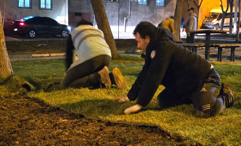 Bozulma riski taşıyan hazır çimleri derhal toprakla buluşturmak için gece mesaisi yapan ekipler, muhtarların nezaretinde çalıştı. Gece toprak zeminle başlayan çalışmalar sonucunda parklar, sabah yemyeşil bir görünüme kavuştu.