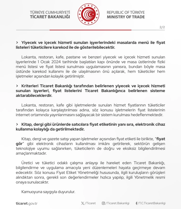 Yiyecek ve İçecek Sektöründe Dijitalleşme: Lokanta, restoran, kafe ve pastane gibi işletmelerde fiyat listeleri, masalarda karekod (QR kod) ile tüketicilere sunulabilecek. Ayrıca fiyat listeleri, Bakanlık tarafından belirlenen sisteme aktarılabilecek.