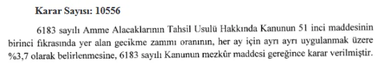 ANKARA (İGFA) - Resmi Gazete’nin bugünkü sayısında yer alan Cumhurbaşkanı Kararı ile, 6183 sayılı Amme Alacaklarının Tahsil Usulü Hakkında Kanun’un 51’inci maddesi kapsamında uygulanan gecikme zammı oranı, her ay için ayrı ayrı uygulanmak üzere yüzde 3,7 olarak belirlendi.