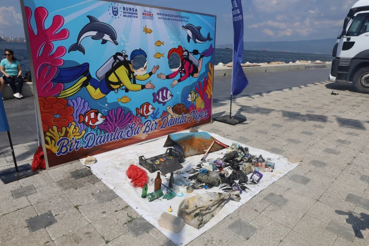 Dalgıçların, Gemlik Körfezi dibinden topladıkları plastik ve cam şişeler, metal ve ambalaj atıklar, oyuncaklar ve mutfak eşyaları, vatandaşların görmesi adına iskelede sergilendi.