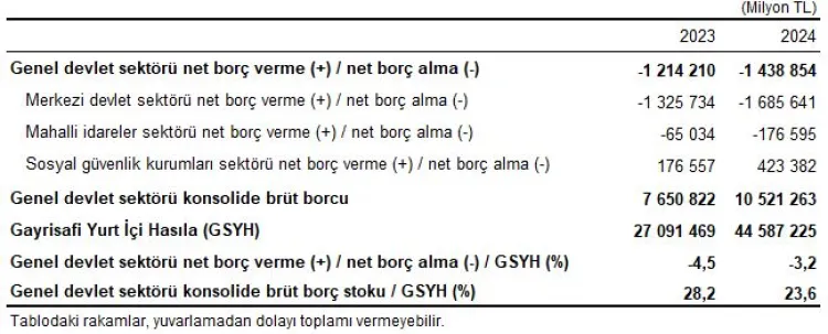 Genel devlet açığı, 1 trilyon 438 milyar 854 milyon TL olarak tahmin edilirken, bu açığın Gayrisafi Yurt İçi Hasıla’ya (GSYH) oranı 2023’teki yüzde 4,5’ten yüzde 3,2’ye geriledi.