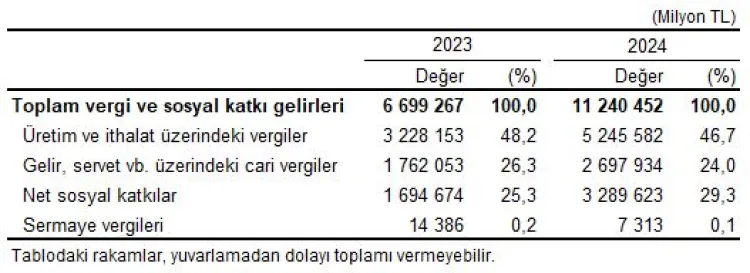 Üretim ve ithalat üzerindeki vergilerin toplam vergi ve sosyal katkı gelirlerindeki payı 2023’te yüzde 48,2 iken 2024’te yüzde 46,7’ye düştü. Gelir ve servet üzerindeki cari vergilerin payı yüzde 24’e gerilerken, net sosyal katkıların payı yüzde 29,3’e yükseldi. Sermaye vergilerinin payı ise yüzde 0,1’e düştü.