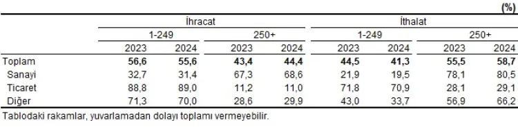 Verilere göre, 179 bin 673 girişim ihracat, 318 bin 603 girişim ithalat yaptı. Eşleştirmede girişimlerin yüzde 100’üne ulaşıldı; ithalattaki girişim artışı, Basitleştirilmiş Gümrük Beyannamesi sisteminden kaynaklandı.Girişim Ölçeklerine Göre Dağılım İhracat: Mikro (1-9 çalışan) girişimler yüzde 75,6’sını oluşturup yüzde 18,8 pay aldı. Küçük (10-49) yüzde 17,5, orta (50-249) yüzde 19,2, büyük (250+) yüzde 44,4 paya sahip.