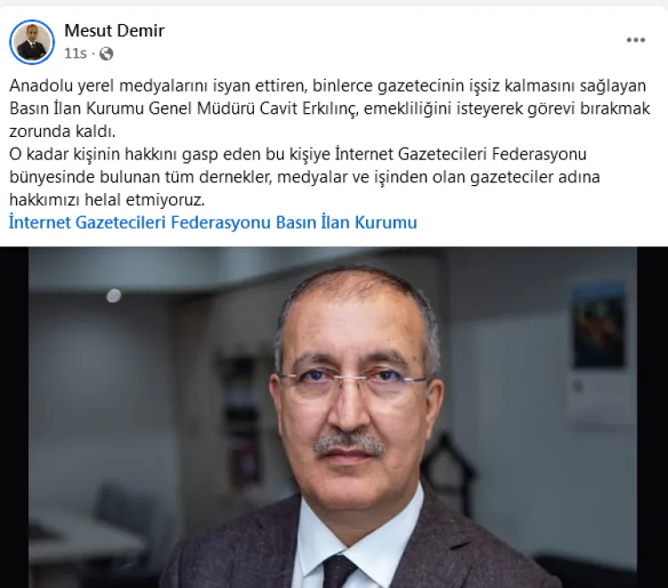 BİK politikalarına yönelik eleştirileri alevlendiren Genel Başkan Demir, paylaşımında, “Anadolu yerel medyalarını isyan ettiren, binlerce gazetecinin işsiz kalmasını sağlayan BİK Genel Müdürü Cavit Erkılınç, emekliliğini isteyerek görevi bırakmak zorunda kaldı. O kadar kişinin hakkını gasp eden bu kişiye İGF bünyesindeki dernekler, medyalar ve işsiz kalan gazeteciler adına hakkımızı helal etmiyoruz” ifadelerini kullandı.
