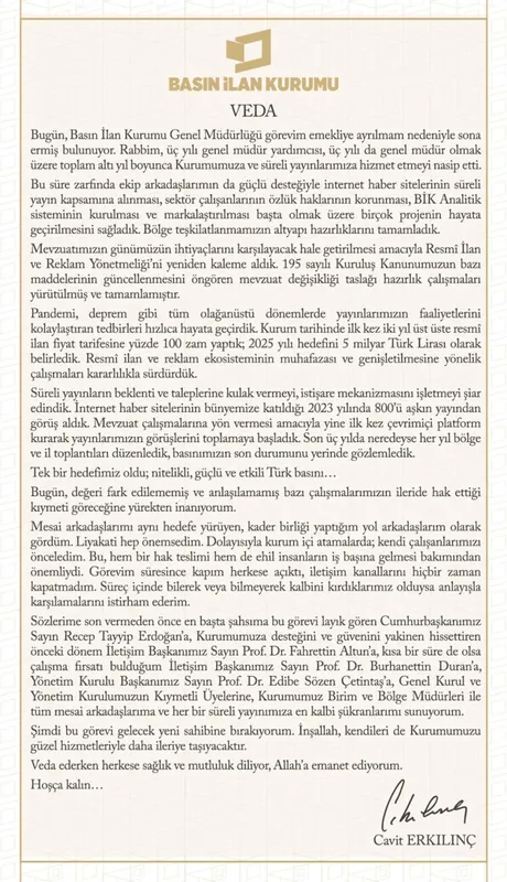 Mesajında, görev süresinde hayata geçirilen çalışmaları da özetleyen Erkılınç, internet haber sitelerinin resmi ilan kapsamına alınması, sektör çalışanlarının özlük haklarının korunması, BİK Analitik sisteminin kurulması ve markalaşma süreçleri ile Resmİ İlan ve Reklam Yönetmeliği’nin revizyonu ile 195 sayılı Kuruluş Kanunu’nda değişiklik taslağının tamamlanması yönündeki çalışmaları anlattı.