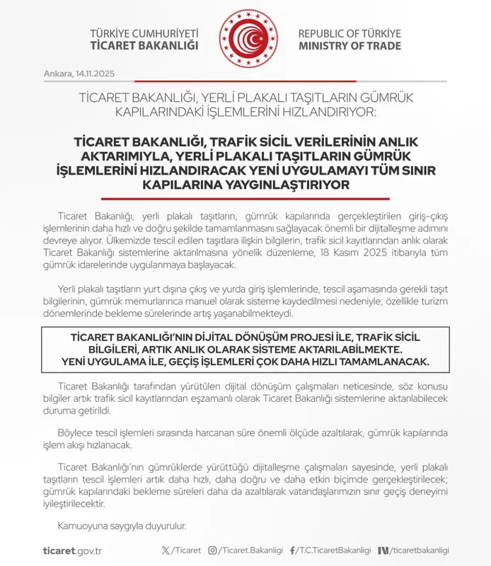 Ticaret Bakanlığı'ndan yapılan açıklamada, yerli plakalı taşıtların tescil işlemleri artık daha hızlı, doğru ve etkin şekilde gerçekleştirileceği belirtilirken, gümrük kapılarındaki bekleme sürelerinin azalacağı, vatandaşların sınır geçiş deneyiminin iyileşeceği duyuruldu.