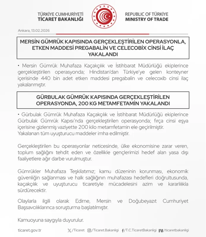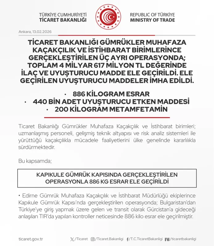 Ticaret Bakanlığı Gümrükler Muhafaza ekiplerinin üç ayrı gümrük kapısında düzenlediği operasyonlarda toplam 4 milyar 617 milyon TL değerinde uyuşturucu madde ve kaçak ilaç ele geçirildi. Yakalanan uyuşturucular imha edildi.