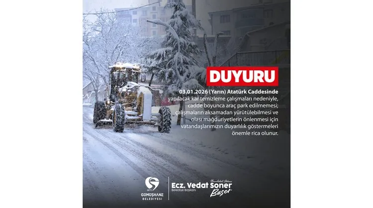 Gümüşhane Belediyesi bir duyuru yayımladı. Duyuru metni, belediyenin resmi kanalları aracılığıyla kamuoyuna açıklandı.