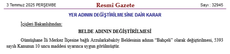 İçişleri Bakanlığı, Gümüşhane Merkez’e bağlı Arzularkabaköy Beldesi’nin adının “Bahçeli” olarak değiştirildiğini Resmi Gazete’de duyurdu.