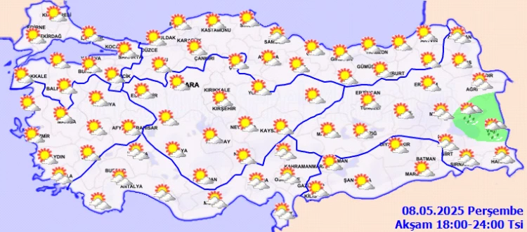 ANKARA (İGFA) - Meteoroloji Genel Müdürlüğü, 8 Mayıs Perşembe gününe ilişkin hava tahmin raporunu yayımladı. Buna göre ülkemiz genelinin parçalı ve çok bulutlu, Akdeniz’in Toroslar mevkii, Batı Karadeniz'in iç kesimleri, Orta ve Doğu Karadeniz, Doğu Anadolu ile Kırklareli, Kahramanmaraş, Karaman, Yozgat, Kayseri, Sivas, Niğde, Adıyaman, Diyarbakır, Batman ve Siirt çevreleri ile Antalya'nın iç kesimlerinin sağanak ve gök gürültülü sağanak yağışlı geçeceği tahmin ediliyor. Güney Ege ve Batı Akdeniz’de toz taşınımı bekleniyor.