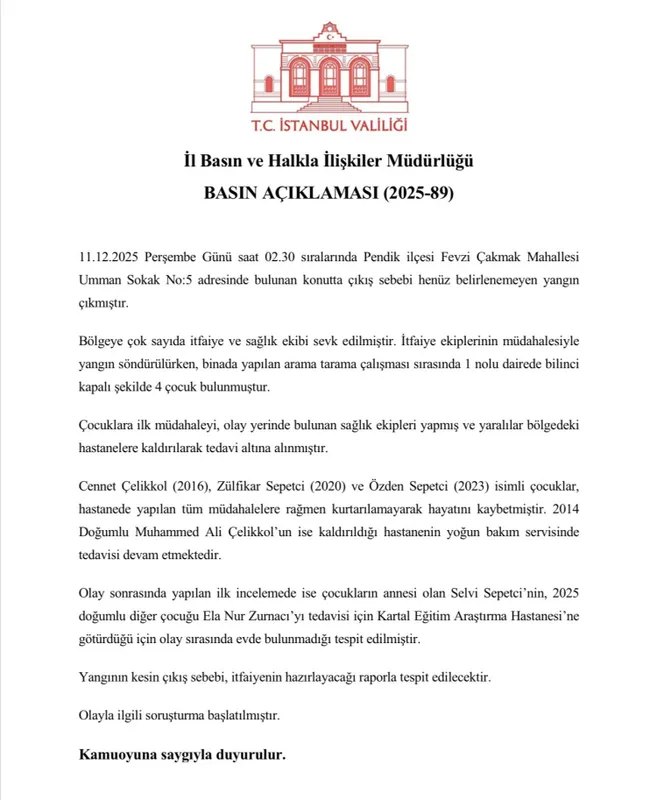 İstanbul'un Pendik ilçesinde Fevzi Çakmak Mahallesi’nde çıkan yangında 4 çocuk yaralandı; 3’ü hayatını kaybetti, 1’inin tedavisi yoğun bakımda sürüyor.