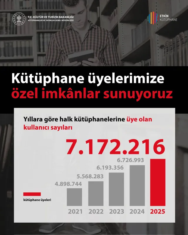 Kütüphaneler ve Yayımlar Genel Müdürlüğü verilerine göre, halk kütüphanelerine üye sayısı 2021’de 4,9 milyon iken, 2025 yılı sonunda 7,17 milyona yükseldi.