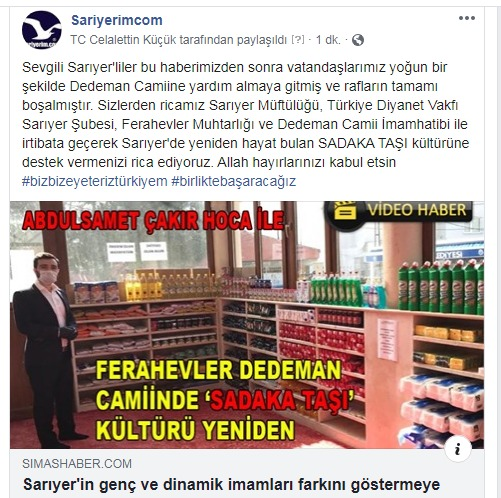 Cami İmamhatibi Abdulsamet Çakır konuya duyarlılık gösteren halkımıza teşekkür ederken, Sarıyer Kaymakamı Mehmet Özer koordinatörlüğünde oluşturulan Sarıyer Vefa Sosyal Destek Grubu oluşumlarından Sarıyer Müftülüğü ve Türkiye Diyanet Vakfı Sarıyer Şubesi himayesinde görev yaptığı Camiide uygulamaya başladığı 'Sadaka Taşı' kültürünün bu kadar kısa sürede büyük ve yoğun ilgi görmesinden dolayı Ecdadı hayırla yad etmek adına çok mutlu olduğunu söyleyerek "Öncelikle bu uygulamayı hayata geçirmemde desteklerini esirgemeyen İle Kaymakamımız Sayın Mehmet Özer ve İlçe Müftüsü ve Vakıf Şube Başkanımız Sayın Oğuzhan Kadıoğlu'na teşekkürlerimi sunuyorum onların destek ve himayeleri sayesinde gönlü zengin hayırsever halkımızında bağış ve destekleriyle neredeyse tamamı boşalan raflarımızı bu sefer bütün ayakkabılık raflarının tamamını kullanmak suretiyle doldurduk. Rabbim destek olan, katkıda bulunan ve buradan ihtiyacını gideren vatandaşlarımızdan razı olsun. Hayırsever vatandaşlarımızın ve kurumlarımızın desteklerini bekliyoruz birlikte başaracağız" dedi.