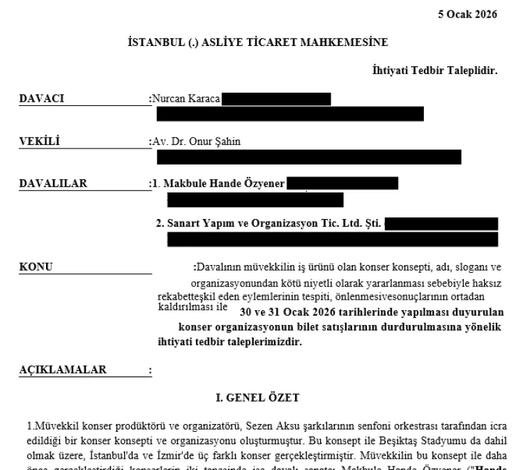 İSTANBUL (İGFA) - 2024 yılında seyirciyle buluşan ve tüm oluşum süreci ile fikri altyapısı Nurcan Karaca’ya ait olan “Hande Bizi Sezen’e Götür! Senfonik” projesiyle ilgili hukuki süreç başlatıldı. Projenin yapımcısı NK Projeler, aynı başlık ve konseptin izin alınmaksızın kullanılarak bilet satışına açılması üzerine yorumcu Hande Yener ve organizasyonu düzenleyen firmaya karşı dava açtıklarını kamuoyuna duyurdu.