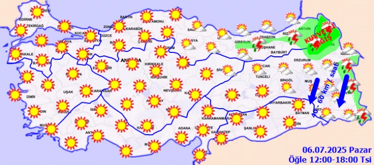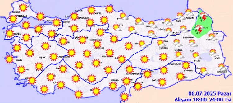 Buna göre Türkiye'nin kuzeydoğu kesimlerinin parçalı yer yer çok bulutlu, Kars, Ardahan, Artvin çevreleri ile Giresun, Trabzon ve Rize'nin iç kesimleri, Erzurum, Ağrı, Van ve Hakkari'nin doğusunun sağanak ve gök gürültülü sağanak yağışlı, diğer yerlerin az bulutlu ve açık geçeceği tahmin ediliyor. Yağışların Erzurum'un doğusu, Kars ve Ardahan çevrelerinde yerel olmak üzere kuvvetli olması bekleniyor.