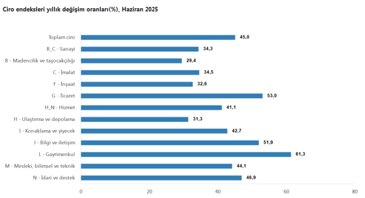 ANKARA (İGFA) - TÜİK’in bugün açıkladığı verilere göre, sanayi, inşaat, ticaret ve hizmet sektörlerini kapsayan toplam ciro endeksi (2021=100), Haziran 2025’te geçen yılın aynı ayına göre yüzde 45 artış kaydetti.