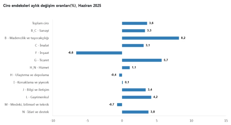 Aylık bazda ise toplam ciro endeksi yüzde 3,6 artarken, sektörlerdeki değişimler şöyle oldu.