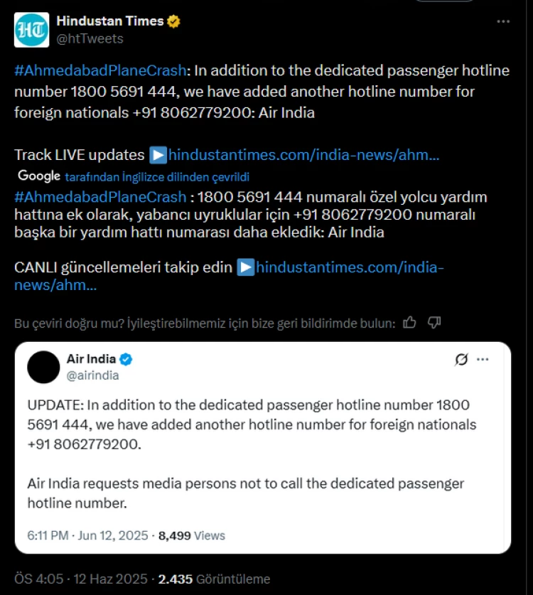 Hindustan Times / ANKARA (İGFA) - Hindistan’ın batısındaki Ahmedabad kentinde, Sardar Vallabhbhai Patel Uluslararası Havalimanı’ndan Londra Gatwick Havalimanı’na gitmek üzere kalkış yapan Air India’ya ait AI171 sefer sayılı Boeing 787-8 uçağı, kalkıştan beş dakika sonra yerleşim bölgesine düştü.