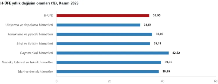 Yıllık bazda en dikkat çekici artış gayrimenkul hizmetlerinde yaşandı. Kasım ayında bir önceki yılın aynı ayına göre; ulaştırma ve depolama hizmetlerinde yüzde 31,51, konaklama ve yiyecek hizmetlerinde yüzde 36,00, bilgi ve iletişim hizmetlerinde yüzde 35,19, gayrimenkul hizmetlerinde yüzde 42,22, mesleki, bilimsel ve teknik hizmetlerde yüzde 39,35, idari ve destek hizmetlerde ise yüzde 38,49 artış gerçekleşti.