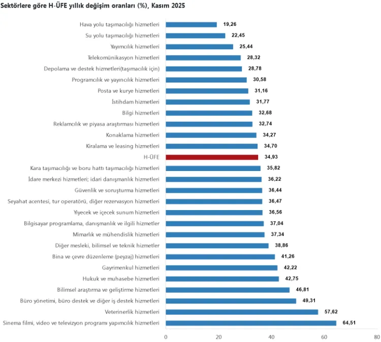 TÜİK’in açıkladığı Kasım 2025 Hizmet Üretici Fiyat Endeksi verilerine göre H-ÜFE aylık bazda düşüş gösterirken, yıllık artış yüzde 34,93 olarak kaydedildi. Yıllık bazda en dikkat çekici artış gayrimenkul hizmetlerinde yaşandı. Veriler, hizmet sektöründe yıllık fiyat artışlarının yüksek seyrini sürdürdüğünü gösterdi.