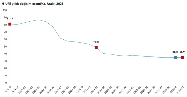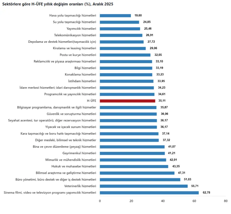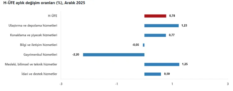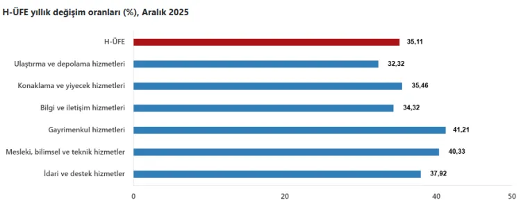 ANKARA (İGFA) - Türkiye İstatistik Kurumu’nun (TÜİK) verilerine göre, Hizmet Üretici Fiyat Endeksi (H-ÜFE) 2025 yılı Aralık ayında bir önceki aya göre yüzde 0,78, bir önceki yılın aynı ayına göre ise yüzde 35,11 artış gösterdi. On iki aylık ortalamalara göre artış oranı ise yüzde 36,78 oldu.