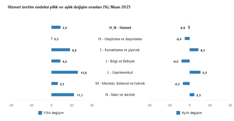 TÜİK verilerine göre, 2025 Nisan ayında hizmet üretim endeksi yıllık bazda yüzde 4,5 artış gösterirken, aylık bazda yüzde 0,6 düşüş yaşadı. Sektörel bazda gayrimenkul hizmetleri aylık ve yıllık bazda en çok değişim gösterenler arasında ilk sırada yer aldı.