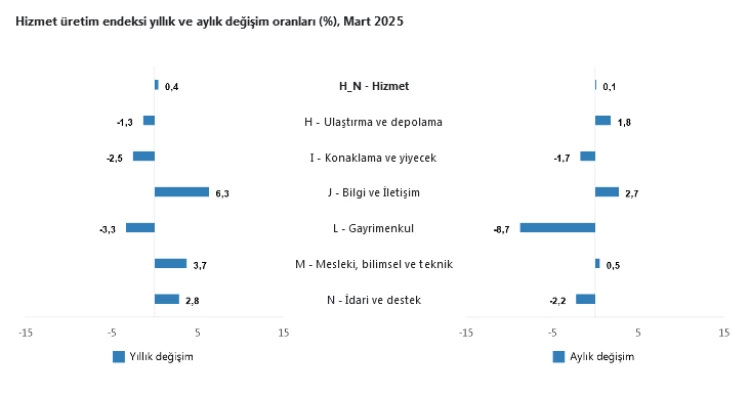 Türkiye’de hizmet üretim endeksi, Mart 2025’te geçen yıla göre yüzde 0,4, bir önceki aya göre yüzde 0,1 yükseldi. Bilgi ve iletişim hizmetleri yıllık yüzde 6,3 artarken, gayrimenkul hizmetleri yüzde 3,3 geriledi.