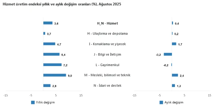 TÜİK'in açıkladığı 2025 Ağustos ayı hizmet üretim endeksine göre endeks yıllık yüzde 3,6, aylık yüzde 0,4 arttı. Mesleki, bilimsel ve teknik hizmetler yıllık yüzde 9 artışla başı çekerken, bilgi ve iletişim hizmetleri aylık yüzde 3,2 düştü. Diğer sektörlerde karışık değişimler gözlendi.