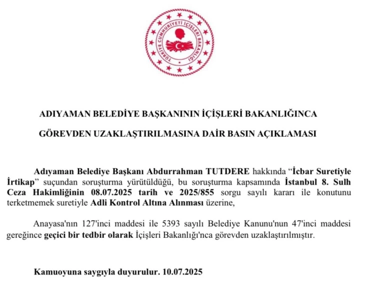 İçişleri Bakanlığı, Adıyaman Belediye Başkanı Abdurrahman Tutdere’nin konutu terk etmeme adli kontrol kararı nedeniyle geçici tedbirle görevden uzaklaştırıldığını duyurdu.