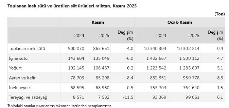 TÜİK verilerine göre ticari süt işletmelerince Kasım ayında 863 bin 651 ton inek sütü toplandı. Toplanan süt miktarı yıllık bazda yüzde 4 azalırken, içme sütü ve tereyağı üretiminde düşüş yaşandı. Ayran ve kefir üretiminde artış kaydedildi.