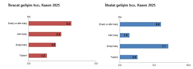TÜİK verilerine göre Kasım 2025’te ihracat yüzde 1,3, ithalat yüzde 2,6 arttı. Dış ticaret açığı aylık bazda yüzde 6,3 yükseldi. TÜİK verileri, 2025 Kasım ayında dış ticarette artışın sürdüğünü ancak ithalattaki daha hızlı yükselişin dış ticaret açığını büyüttüğünü ortaya koydu.