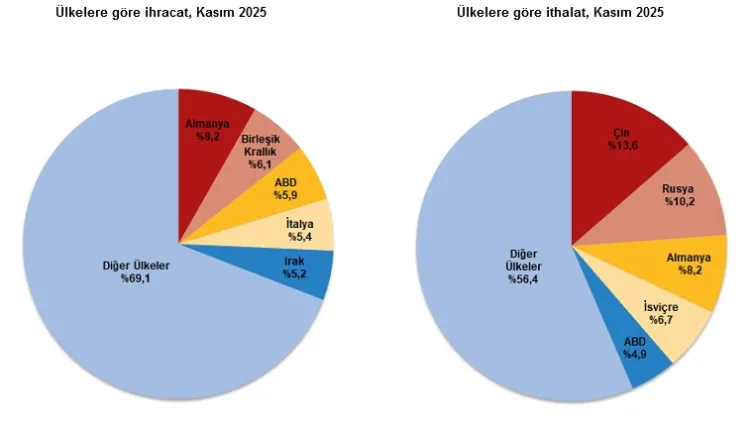 Kasım ayında ithalatta ilk sırayı 4 milyar 153 milyon dolar ile Çin aldı. Çin’i Rusya Federasyonu, Almanya, İsviçre ve ABD takip etti. İlk beş ülkeden yapılan ithalat, toplam ithalatın yüzde 43,6’sını oluşturdu.