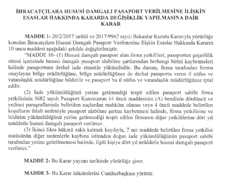 “İhracatçılara Hususi Damgalı Pasaport Verilmesine İlişkin Esaslar Hakkında Karar”ın 10’uncu maddesinde yapılan düzenlemeyle, yeşil pasaportun iade süreci ve yaptırımları yeniden şekillendirildi.