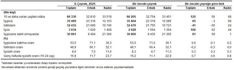 Türkiye İstatistik Kurumu (TÜİK), 2025 yılı II. çeyreğine (Nisan-Haziran) yönelik Hanehalkı İşgücü Araştırması sonuçlarını açıkladı. 15 ve üzeri yaştaki kişilerde işsiz sayısı bir önceki çeyreğe göre 106 bin kişi artarak 3 milyon 34 bine ulaştı, işsizlik oranı ise 0,3 puan yükselerek yüzde 8,6 oldu. İstihdamda ise azalma gözlendi.
