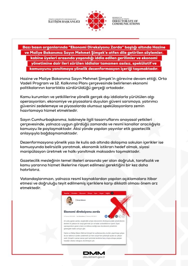 Hazine ve Maliye Bakanlığı, bazı basın organlarında “Ekonomi Direksiyonu Zorda” başlığıyla Bakan Mehmet Şimşek’e atfen yer alan iddiaların ve kabine gerilimi söylentilerinin tamamen asılsız olduğunu duyurdu. İletişim Başkanlığı Dezenformasyonla Mücadele Merkezi, Bakan Şimşek’in görevine devam ettiği ve ekonomi politikalarının kararlılıkla sürdürüldüğü vurgulandı.