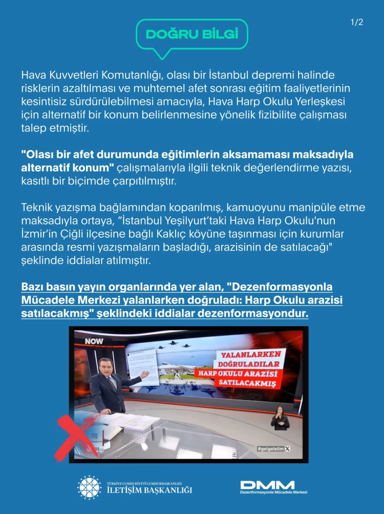 İletişim Başkanlığı Dezenformasyonla Mücadele Merkezi'nden yapılan yazılı açıkalmada, "Hava Kuvvetleri Komutanlığı, olası bir İstanbul depremi sonrası eğitim faaliyetlerinin kesintisiz sürmesi için Hava Harp Okulu Yerleşkesi'ne alternatif konum fizibilite çalışması talep etmiştir. Teknik yazışma, bağlamından koparılarak "Hava Harp Okulu’nun İzmir’e taşınacağı ve arazinin satılacağı" şeklinde çarpıtılmıştır. Merkezimiz, iddiaları yalanlamış ve Hava Harp Okulu’nun taşınmasına yönelik bir karar olmadığını vurgulamıştır. Yerleşkede deprem riskine karşı güçlendirme ve kapasite artırım çalışmaları devam etmektedir. Kamuoyunu yanıltıcı dezenformasyon kampanyalarına itibar edilmemelidir" ifadeleri yer aldı.