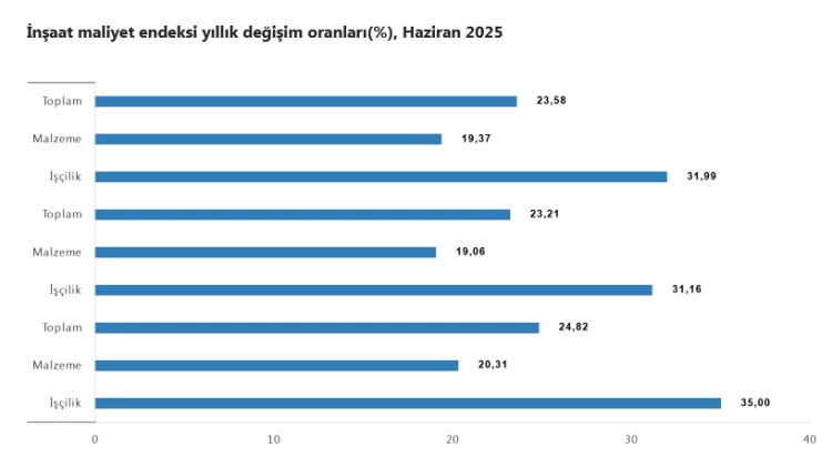 Bina inşaatı maliyet endeksi, Haziran 2025’te aylık yüzde 0,97, yıllık yüzde 23,21 artış gösterdi. Aylık bazda malzeme endeksi yüzde 1,76 artarken, işçilik endeksi yüzde 0,38 azaldı. Yıllık bazda ise malzeme endeksi yüzde 19,06, işçilik endeksi yüzde 31,16 yükseldi.