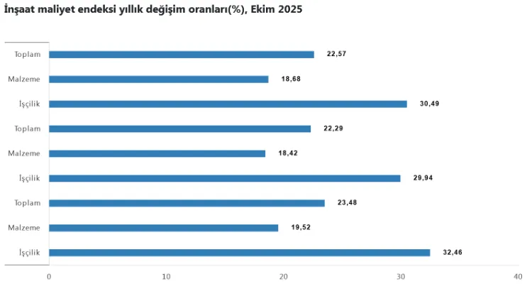 TÜİK’in açıkladığı Ekim 2025 verilerine göre inşaat maliyet endeksi yıllık bazda yüzde 22,57 yükselirken, aylık artış yüzde 0,98 oldu. İşçilik maliyetlerindeki yıllık artış yüzde 30’u aşarak dikkat çekti.
