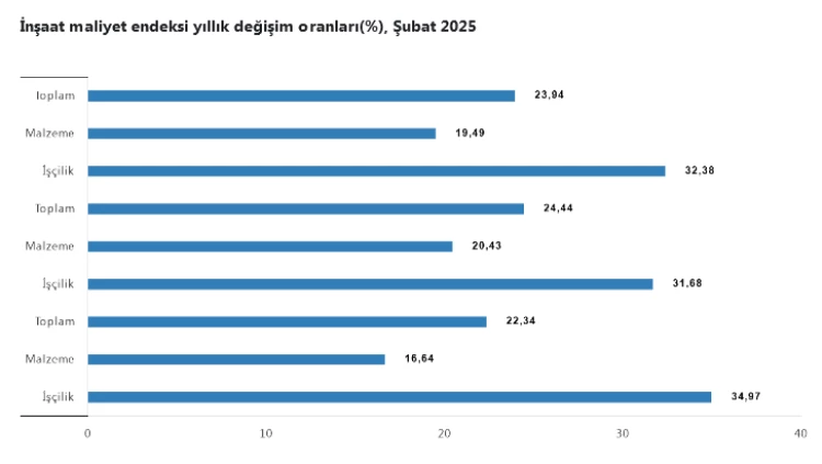 Şubat'ta bir önceki aya kıyasla malzeme endeksi yüzde 1,99 artarken, işçilik endeksi yüzde 0,02 geriledi. Yıllık bazda ise malzeme endeksi yüzde 19,49, işçilik endeksi ise yüzde 32,38 artış kaydetti.