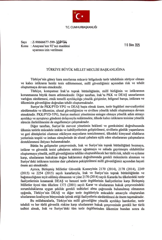 Türkiye Büyük Millet Meclisi (TBMM), Irak ve Suriye’ye asker gönderme yetkisini 30 Ekim 2025’ten itibaren 3 yıl süreyle uzattı. Cumhurbaşkanı Recep Tayyip Erdoğan'ın imzasını taşıyan Cumhurbaşkanlığı tezkeresi, Genel Kurul’da kabul edildi.