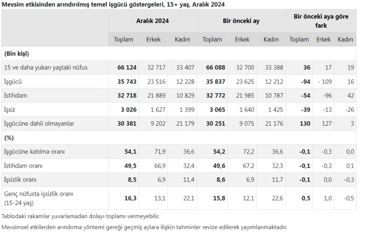 TÜİK'in açıkladığı 2024 yılının son ayına ilişkin İşgücü İstatistikleri'ne göre mevsim etkisinden arındırılmış işsizlik oranı yüzde 8,5 seviyesinde gerçekleşirken, istihdam oranı yüzde 49,5 oldu.