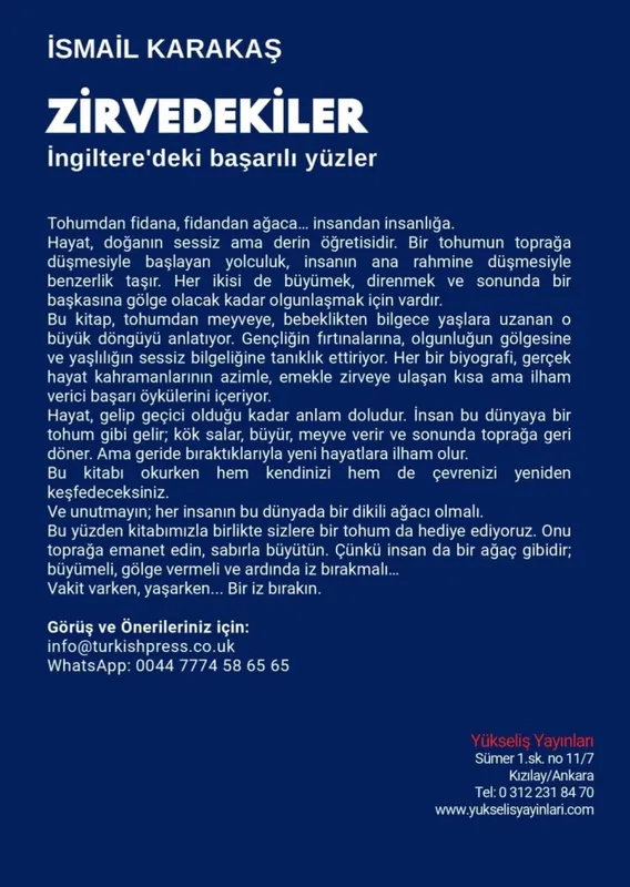 Araştırmacı-yazar ve gazeteci İsmail Karakaş’ın, İngiltere’deki Türk girişimcilerin başarı öykülerini anlattığı “Zirvedekiler” kitabı, Yükseliş Yayınları’ndan çıktı. Çevresel farkındalık için ağaç tohumu hediye eden kitap, Londra ve İstanbul’da tanıtılacak.