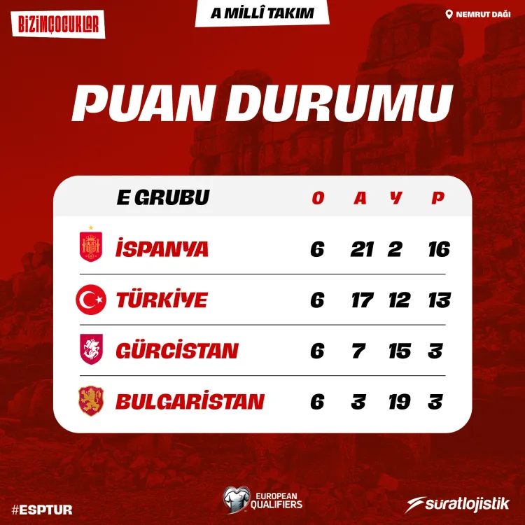 2026 FIFA Dünya Kupası Avrupa Elemeleri E Grubu’nun son maçında Türkiye, deplasmanda İspanya ile 2-2 berabere kalarak grubu 13 puanla ikinci sırada tamamladı. Ay-yıldızlılar, Dünya Kupası'na katılmak için Mart 2026'da play-off oynayacak. Kura çekimi 20 Kasım Perşembe günü Zürih'te yapılacak.